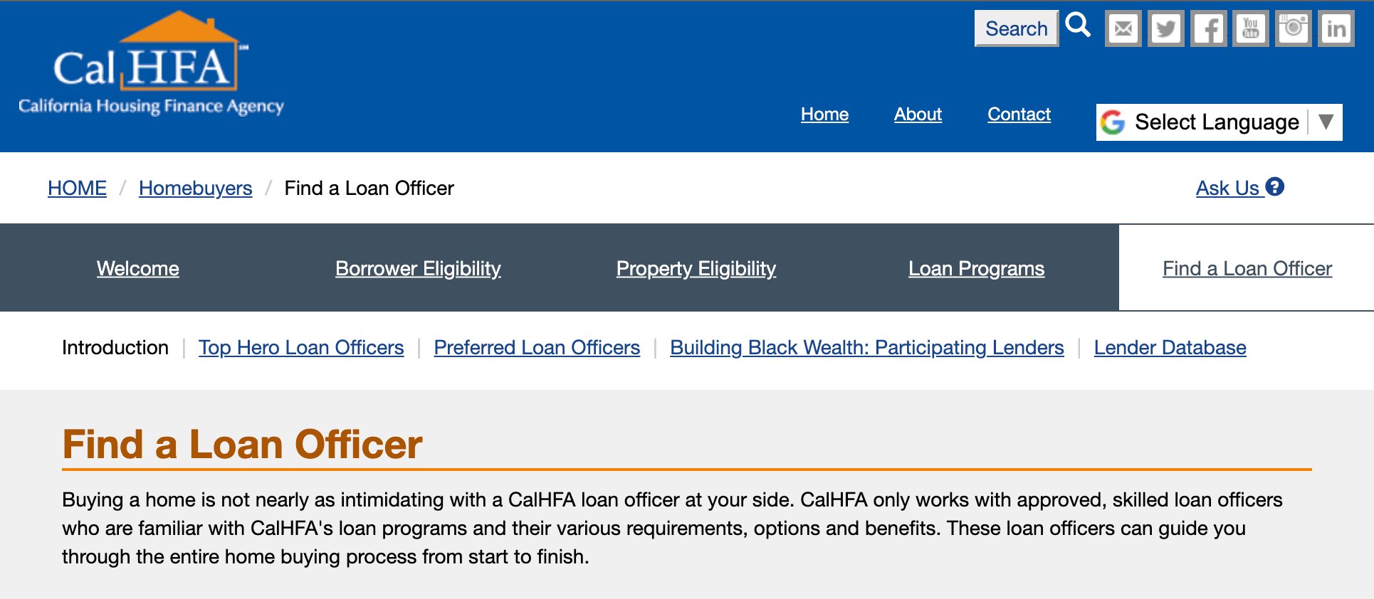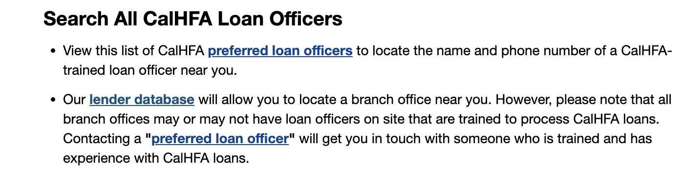 Now scroll down to the "Next Steps" section and click on the CalHFA Approved Lender link. It should take you here: